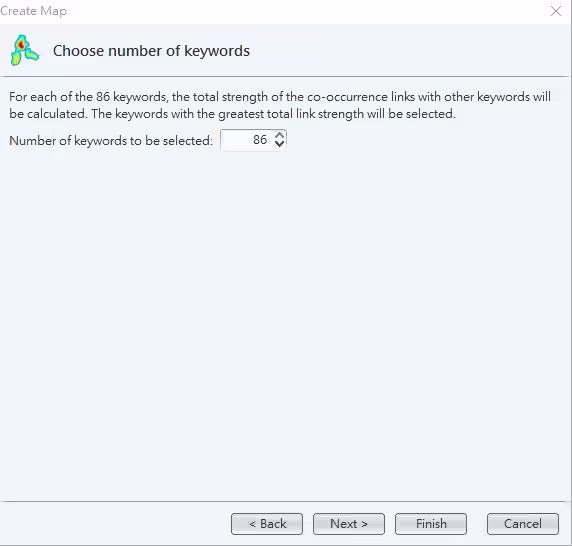 - 選擇閾值(以 KeyWords Plus 為例,關鍵字出現 5 次以上者將被統計出來):